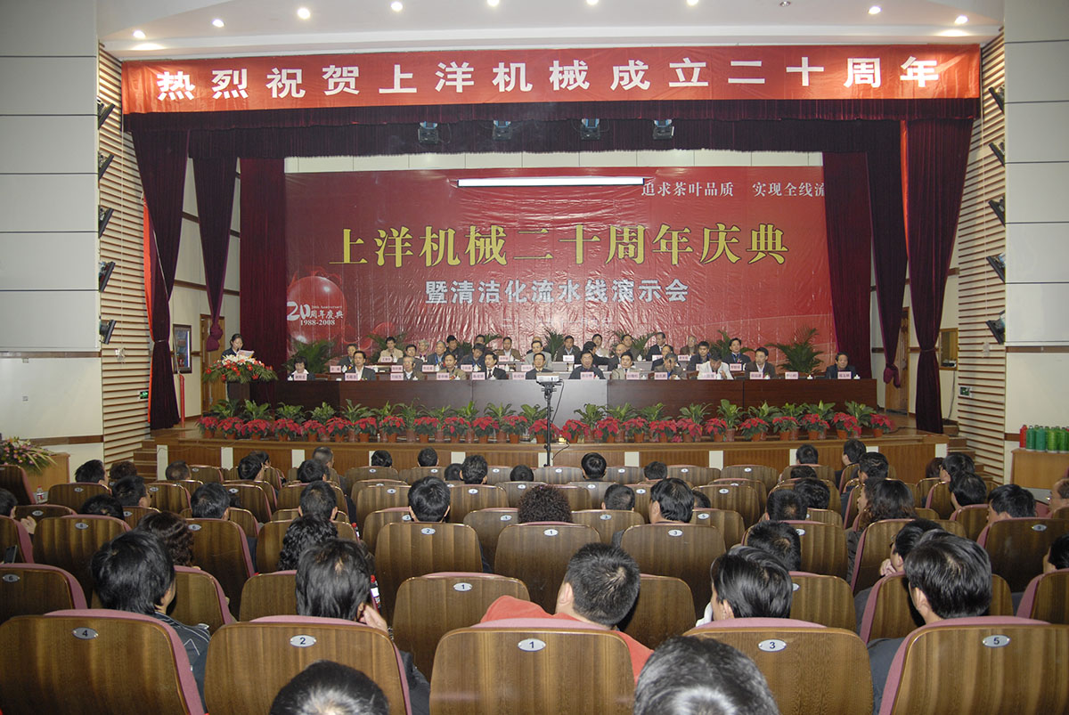 2008年,企業喜遷辦公大樓,上洋二十周年慶典隆重召開,來自社會各界領導及茶界專家、客戶共600余人參會。企業以“使清潔化更清潔,讓流水線流起來”為理念,引導茶加工產業發展新潮流,標志著公司在發展進程中邁出新的一步。