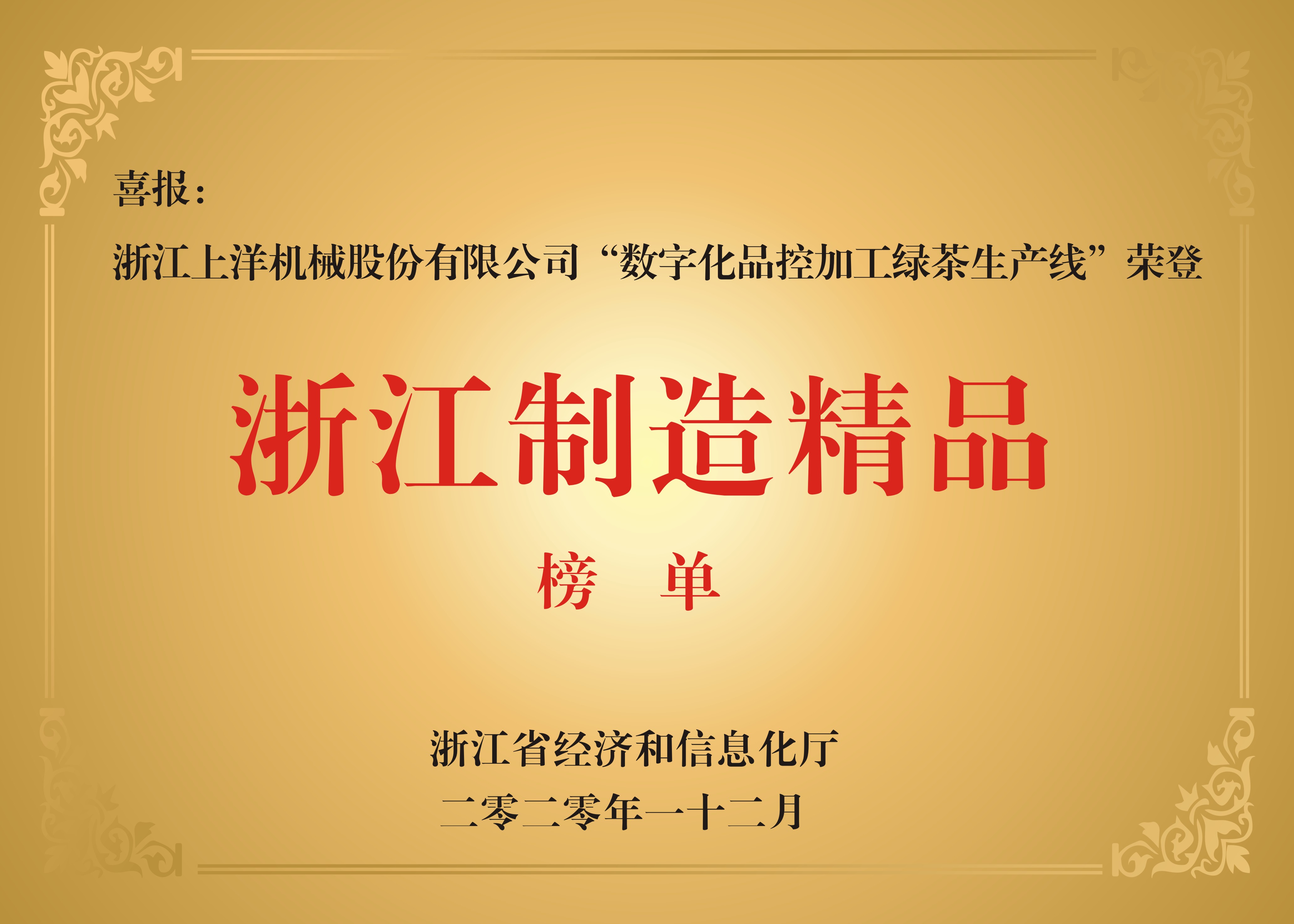 2020年, “6CRK-55茶葉揉捻機”獲“浙江制造品字標”認證榮譽,“數字化品控加工綠茶生產線”榮登“浙江制造精品”榜單。