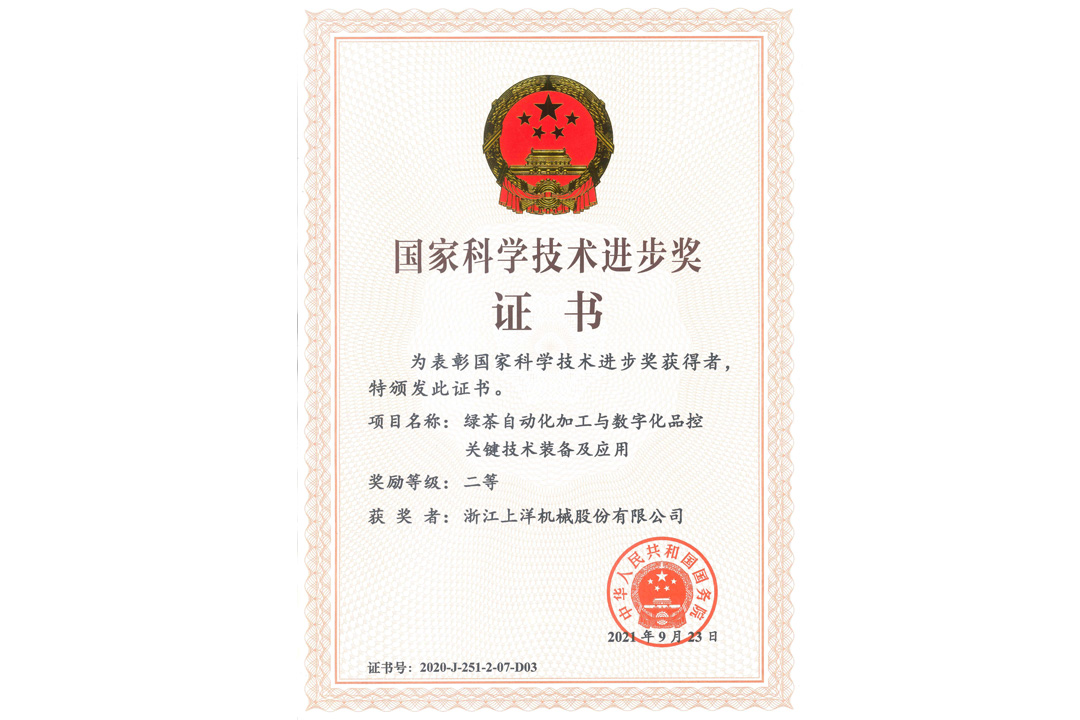 2021年11月3日,公司與安徽農業大學等單位聯合申報的《綠茶自動化加工與數字化品控關鍵技術裝備及應用》獲得國家科學技術進步獎二等獎。公司按照“品控數字化-加工自動化-技術體系化”思路,歷經14年攻關和應用,獲獎項目技術及裝備推廣至我國所有產茶省(市、區)的 1200 多家茶葉企業。