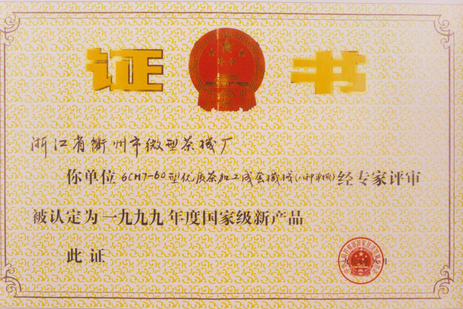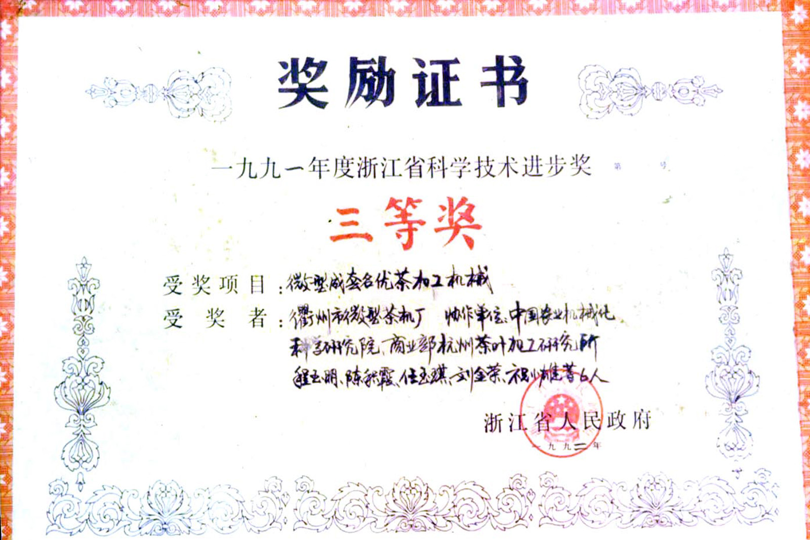 1991年,微型成套名優茶加工機械通過省級新產品鑒定,這是國內最早通過省級鑒定的茶機產品,同年該產品分別榮獲浙江省科技進步三等獎。